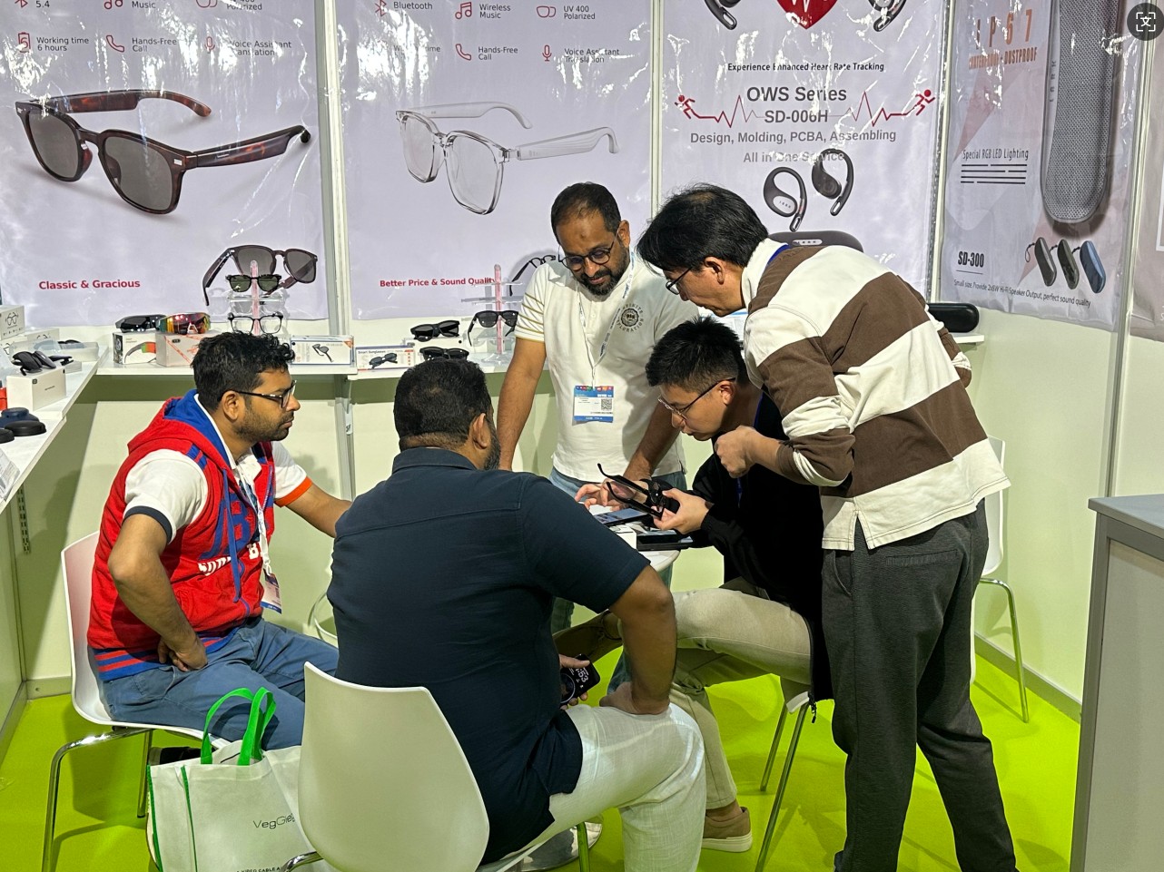 Na feira, apresentamos nosso mais recente estilo de óculos para câmera inteligente, óculos de áudio, fones de ouvido sem fio, fones de ouvido para monitoramento de frequência cardíaca e alguns itens futuros para 2026, como fones de ouvido para jogos e óculos esportivos.